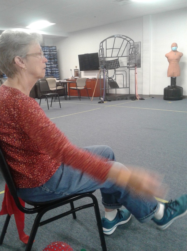 It works wonders. Physical exercise seems to have the same if not better affect to her mobility as the meds. She is often tired afterward but her spirits are brighter and for a few hours she seems to move better. For Cheryl, having a specific time and a class of similar folks, seems to work better. She is able to but uninterested in doing these same exercises at home. The community atmosphere is encouraging to her.