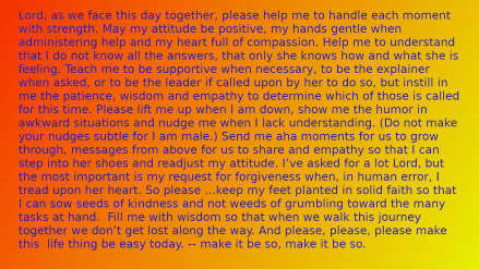 Take care of your mental health. If you spend a great portion of your day caring for another or others, take time for yourself occasionally. When your grumpiness takes control it is time to go out and find balance.