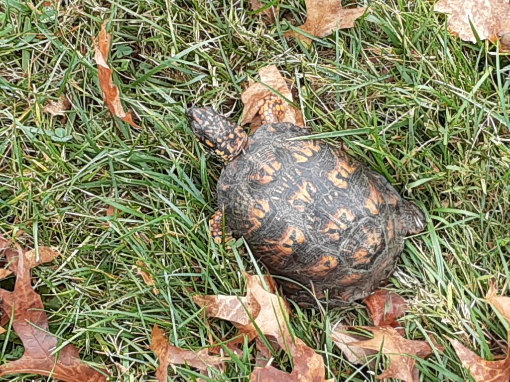Older folks walk looking down for trip hazards. At least I do. This little guy was getting ready to cross the walk I was on when I happened upon it. As you can see this tortoise has decorated itself for Autumn and blends easily with the oak leaves nearby. I almost missed it but it was startled by my passing and turned to go the other way.