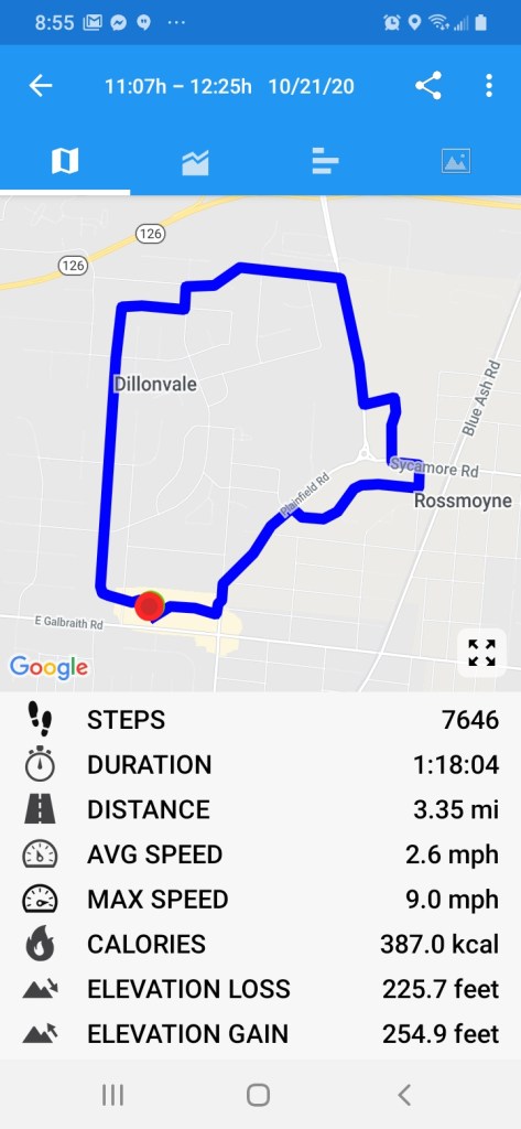 It is the Fall of the year. The time to transition to walking from bike riding. Yesterday I started to do just that. It is cloudy and damp and hot for October but I enjoy walking through several neighborhoods near our home. I will still ride. I bought some kit to hopefully extend my riding into late fall and winter months but today I walked.