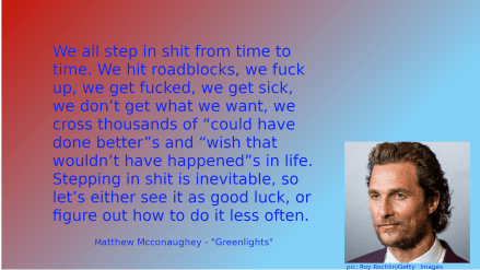 Matthew McConaughey’s book Greenlights is a collection of diary entries, stories and journal entries that he has written through life. He is not a hero by any means but he pulled himself up and spent a large portion of his life trying to impress and live up to his perceived view of how his father perceived him. He is doing okay.