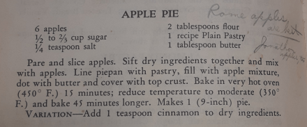 This particular recipe guidance is a favorite one. As you can see specific types of apples and the resulting pie has been noted by Cheryl. When she drug me down the cooking road a couple years ago I picked up what we call the “Big Green Cookbook”, so called because it is about two inches thick and has a green cover, to learn how to do pies. This book reads much like my grandmother’s cookbook that is a collection of church ladies’ recipes entitled “Culinary Cullings” from a farming community in Rich Hill, Missouri.