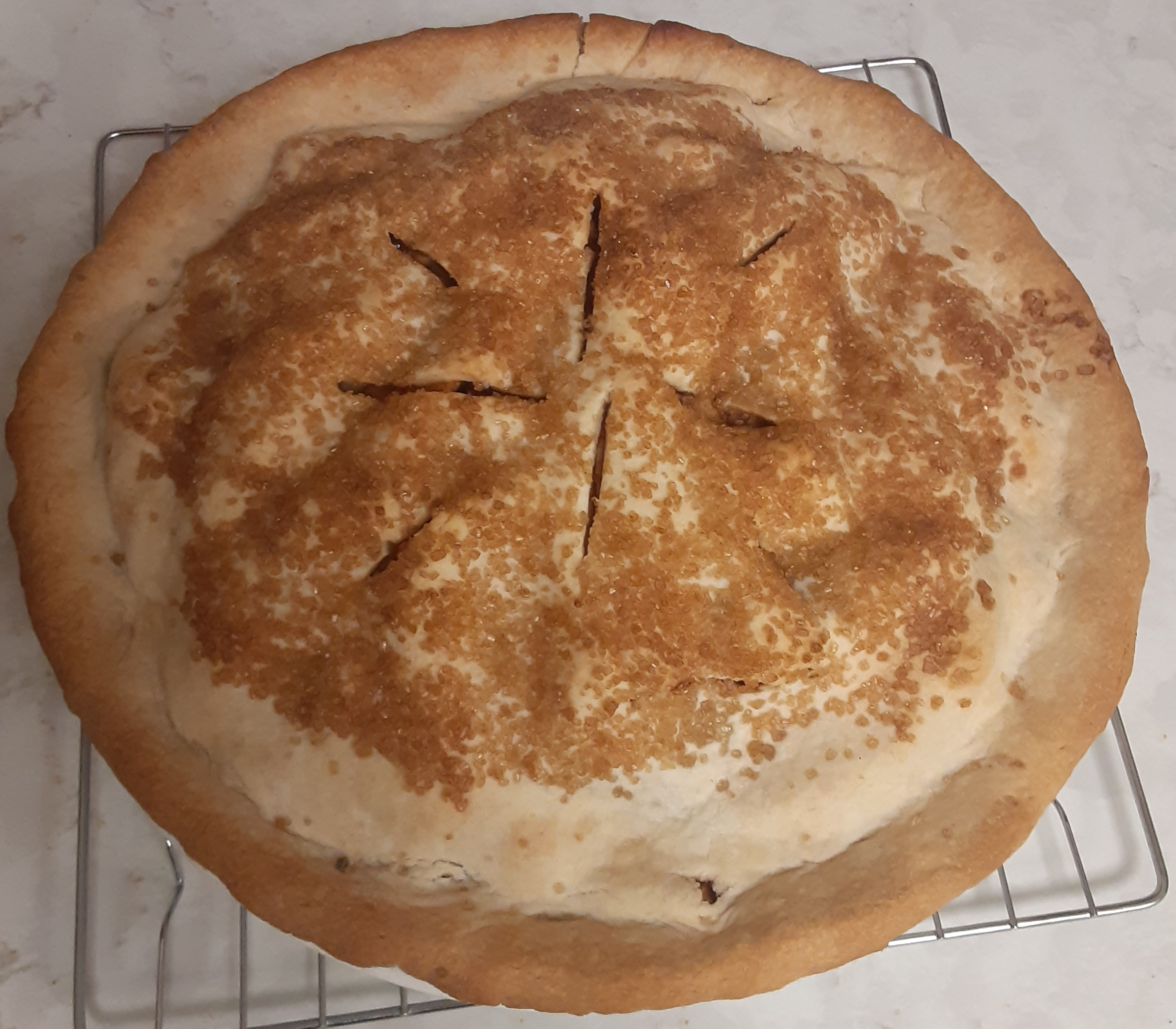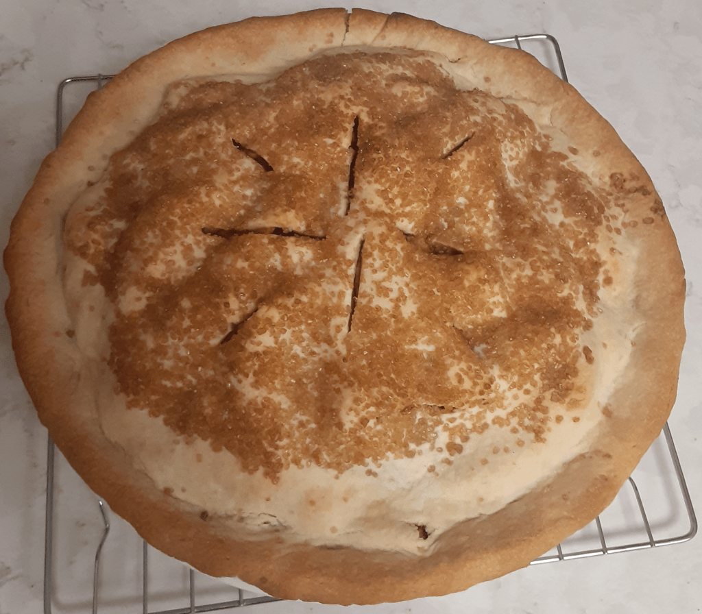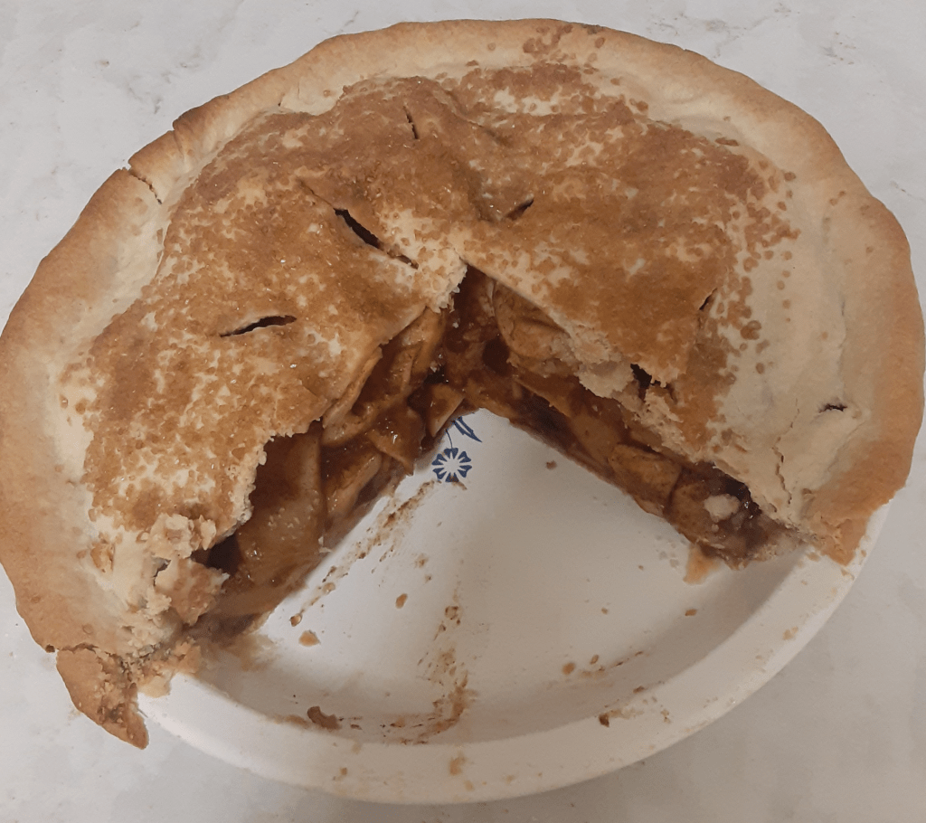 “6 apples” but no reference to general size. “1/2 to 2/3 cup”is the same as writing some but not too much. It makes me smile to read these measurements. (1 recipe plain pastry — but no hint about where to find that.) I have modified and added to the instructions myself. Since it is unspecified I use dark brown sugar with my teaspoon of cinnamon. I also add a couple tablespoons of tapioca. I got this last one from my mother who learned how to make pie from my grandmother. I think I got my bravery to adjust ingredients and try new spices from Mom. She was pretty damn good cook and liked to have a gin and tonic while doing it. Perhaps I will try a gin and tonic with my next pie.