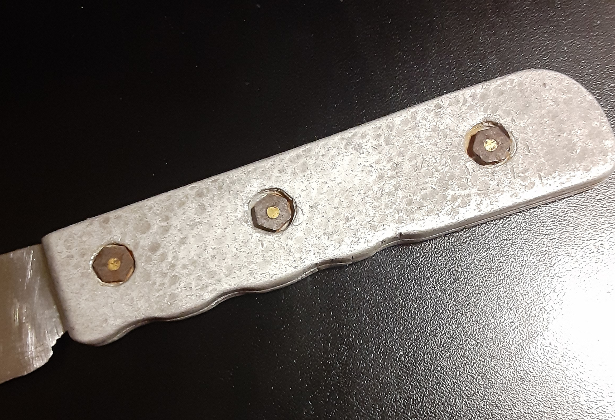 As a child I always thought of it as “The Knife”. It is not the knife I used as a child of six years or so to slice open the back of my left index finger. The Knife was made by Federal Cutlery Co. N. Y. That is stamped into the side of the blade. The handle however looks to be my father’s handiwork. He made a couple pieces of wrought iron furniture when he was in Hughes high school. It would not surprise me if he had repaired this knife at Hughes and kept it for my Mom. Or found it somewhere in New York when they lived there shortly after the war. I was a toddler then. I do not know the story. I should have asked when Dad was still alive.