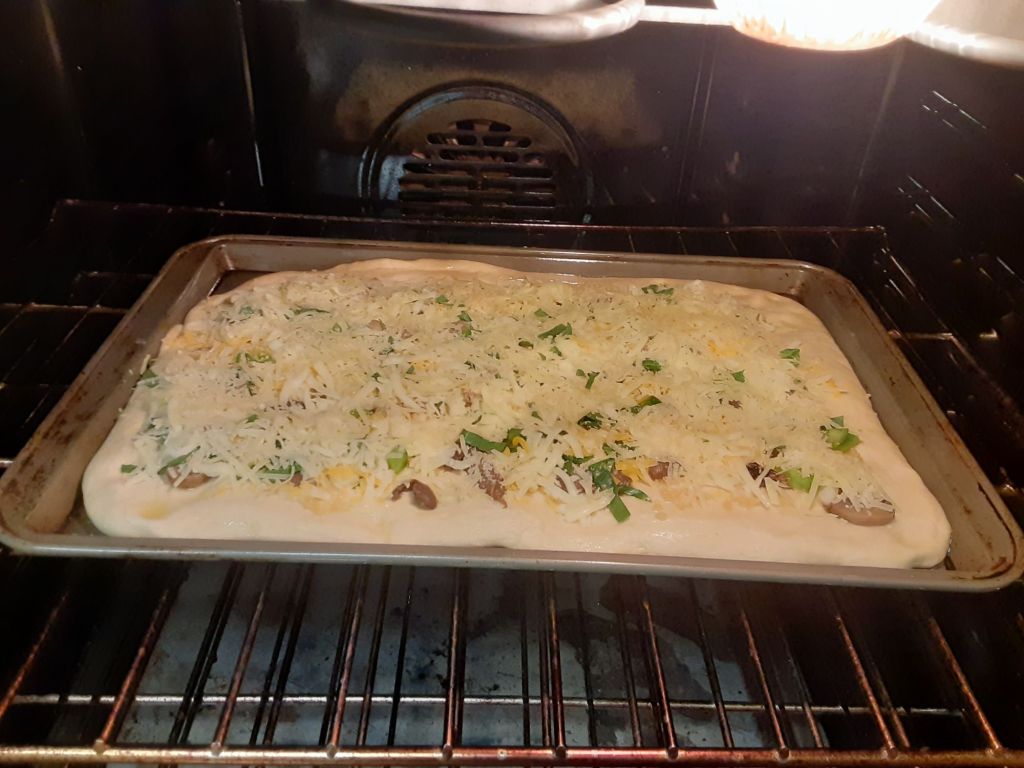 Alas again I am out of fresh Romano. Another adjustment to my normal pizza activity. I forgot to mention that I intended to use Robyn’s recipe for focaccia and make a white pizza. I sprinkled the veggies with a combination of mozzarella, Colby-jack and parmesan.
