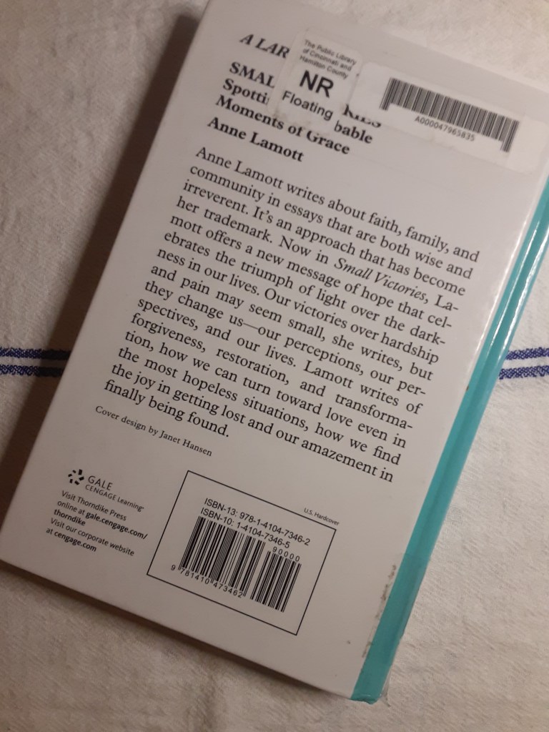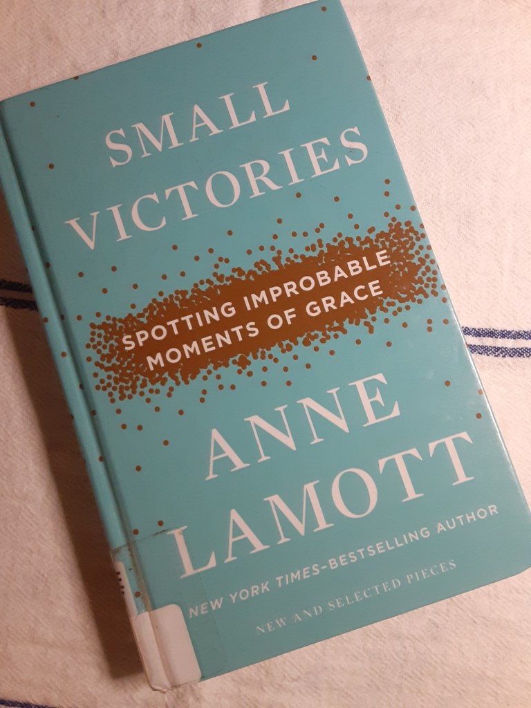 I have a lot of nothing to do lately. It consumes my whole day, however, it is interesting and amusing to me that I can spend all of this time with nothing to do doing nothing and not lose interest. How I tripped over Anne Lamott is a true mystery and I love mysteries. Did I say that? Already? Was Cheryl talking to me? Her book, “Small Victories [Spotting improbable moments of grace]” is not one I would have selected while shopping at the library, nevertheless, it showed up on the holds shelf for me. I did not steal someone else’s hold (I checked) but I wonder what was going through my head when I put it on hold. I put the hold on the LARGE PRINT addition which is often available when all other versions are out which means I felt an urgency to finding a copy. This is truly mysterious.