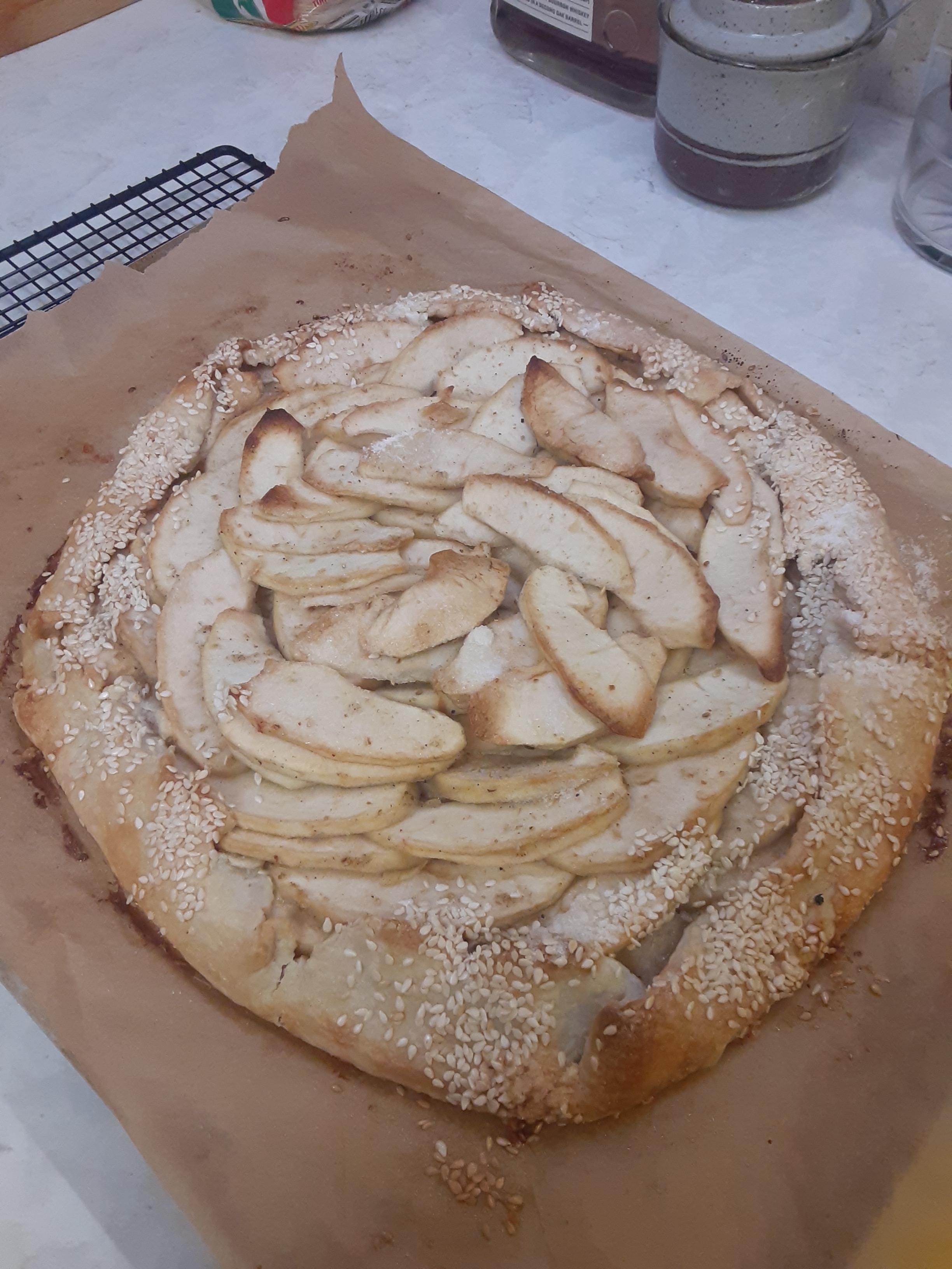 - Remove the dough from the fridge and plop the sesame spread in the center. Use the back of a spoon to evenly distribute the sesame spread, leaving a 2-inch border. Arrange the apples on top in whatever manner you like. Fold the edges of the dough over the apples to form the crust, then brush the dough with heavy cream and sprinkle with sesame seeds and more sugar.