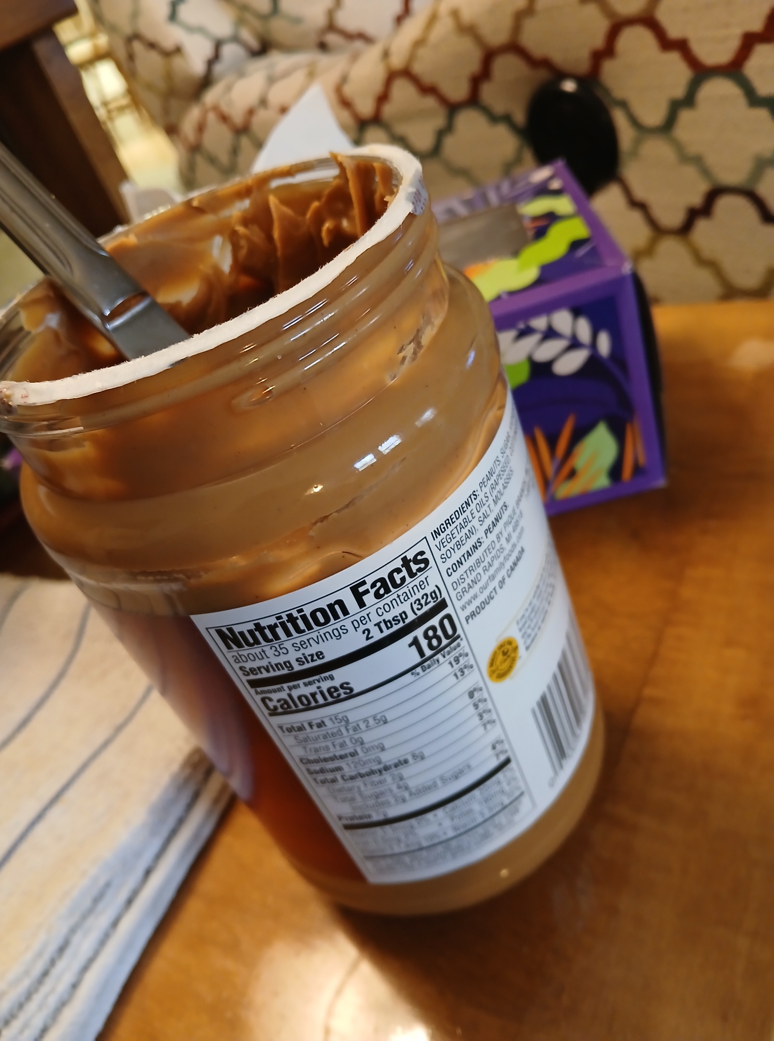 Later on I had some peanut butter too. This was plain old Our Family peanut butter. I happen to like the house brand at the close by IGA. Jif is good too but why pay more for the same amount of calories? 180 calories in two tablespoons full. Nutella has more calories still but for the same amount of substance. I have tried substitute brands of Nutella but it is just not the same. Both of these need spreading on something. I prefer toast in both cases but a cracker of some sort works in a pinch. 180 calories as a minimum daily intake is a sham unless you are licking a spoon.