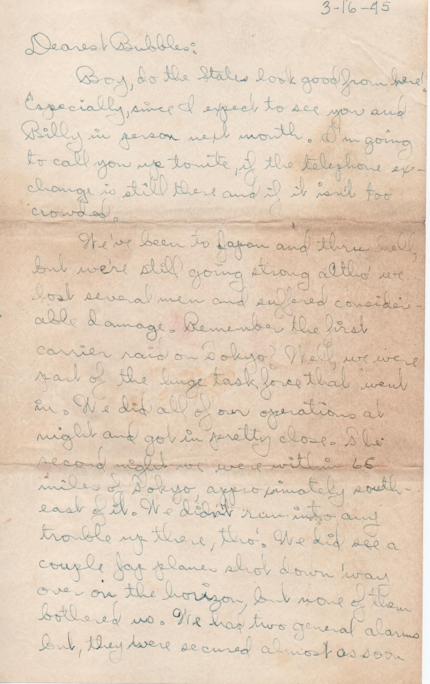 We’ve been to Japan and thru hell, but we’re still going strong altho’ we lost several men and suffered considerable damage. Remember the first carrier raid on Toyko? Well, we were part of the huge task force that went in. We did all of our operations at night and got in pretty close.The second night we were within 65 miles of Tokyo, approximately southeast of it. We didn’t run into any trouble up there, tho’. We did see a couple of Jap planes shot down ‘way over on the horizon, but none of them bothered us. We had two general alarms but they were secured almost as soon as we got to our GQ stations. The fatal one came on Feb. 21st, just about 5:30 PM. We were just going to chow. At the time, before I let this get away from me, we were down around Iwo Jima. The invasion had started on the 19th and on the 21st, we were due to start supporting operations. That day we sailed within 15 miles of Iwo and could see it off our starboard beam there was quite a bit of smoke rising off of it, so I guess the war on it, was getting pretty hot. We were still in sight of it when we got hit. About forty Jap planes were involved in the whole attack. And we and three destroyers were alone, since we’d left the main task force to lone-wolf it. I can’t go into any details, ’cause I’d be writing for a month if I did. I’ll write more later and tell you a lot in person. Anyway the Japs were all mostly suicide planes and tried to dive in on us. They had to be blown up before thay could be stopped. Only a few actually got to the ship, thank heaven and our gunners The attack lasted about three hours and during that time several “jeep” carriers (CVE’s) showed on our horizon and immediately got under attack. Two were hit and one of them blew up and capsized in about twenty minutes. I guess very few of those boys got out. The attack finally ceased, and we had to land a few of our planes. The flight deck on our bow was all crumpled up and we couldn’t put the planes back aft up there, so we had to throw them in the drink. Most of them were ruined with schrapnel anyway. (By the way, I work in arresting gear, the stuff that stops the planes they land on board.) After the alarm was over, we proceeded to Eniwetok Atoll, to send some of our wounded by plane to Pearl Harbor and transfer our gasoline off the ship. From Eniwetok went to Pearl and then to here. I’m sure glad to be back, but I sure feel sorry for those poor boys we had to bury in the drink. There was a lot of them who were burned to death or were blown apart. Several died of burns or wounds on the way to Eniwetok. I was on a burial party that sacked up a few of them. I knew two of the boys and it gave me a funny feeling to put them in the sacks. A 5 inch shell is put in the sacks with them, so that they’ll sink.