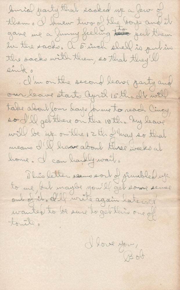 I’m on the second leave party and our leave starts April 15th. It will take about four days for me to reach Cincy, so i’ll get ther on the 19th. My leave will be up on the 12th of May so that means I’ll have about three weeks at home. I can hardly wait.
