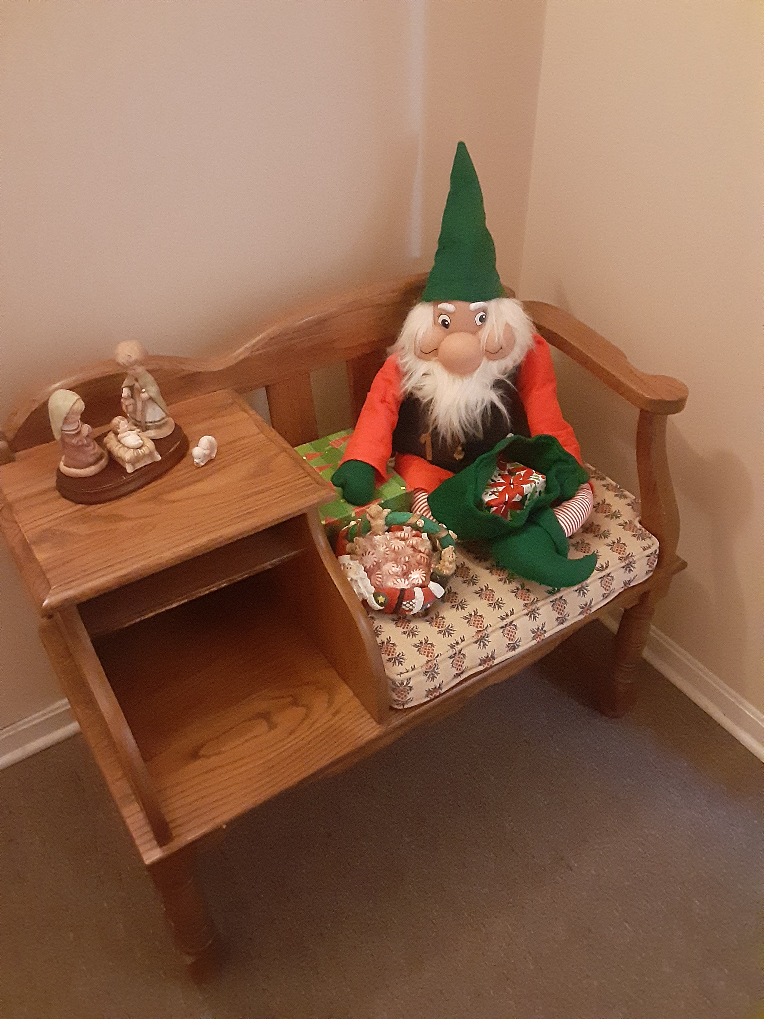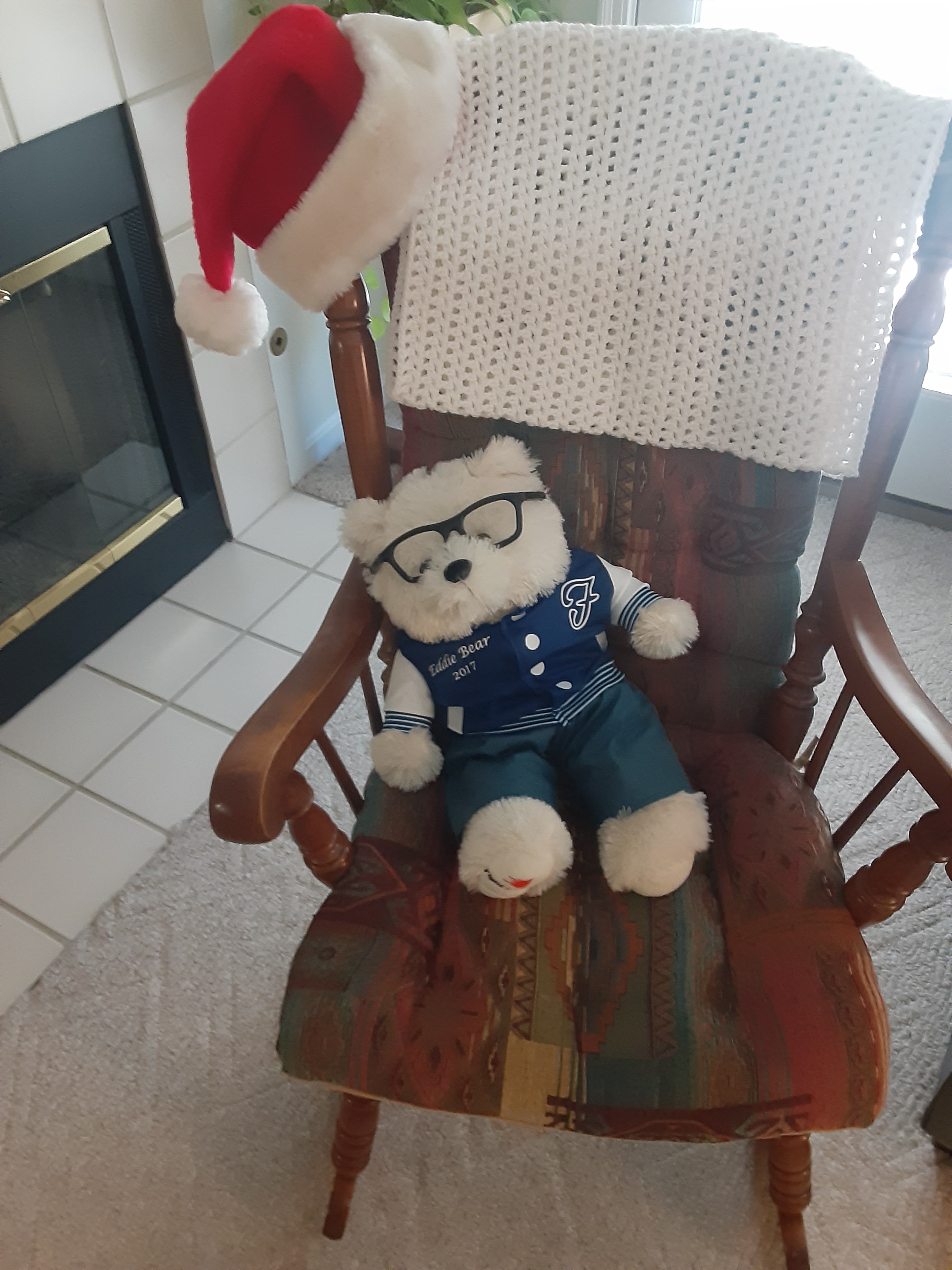 Eddie bear always gets booted from his seat next to the telephone. He lost his telephone long ago. He seems to be okay with the rocker and he has a place to hang his elf hat.