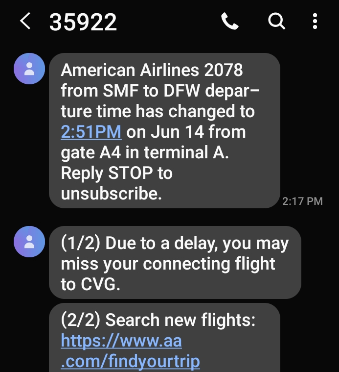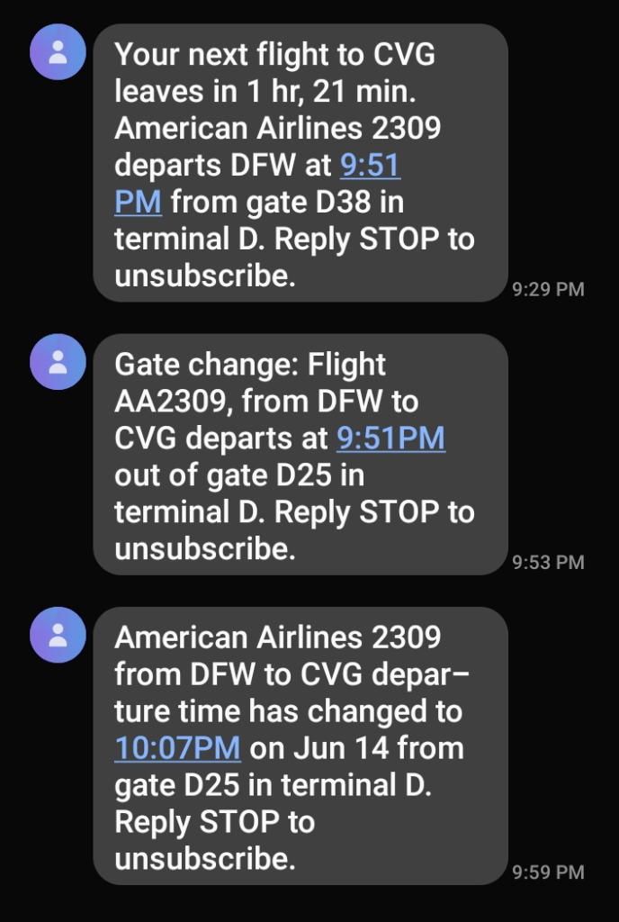 And DFW has a hotel built into the terminals. It is a Hyatt. The plane did land a little after 2PM and the ground crew did turn it around in about 45 minutes. Off we went to DFW maybe 35 minutes behind schedule.